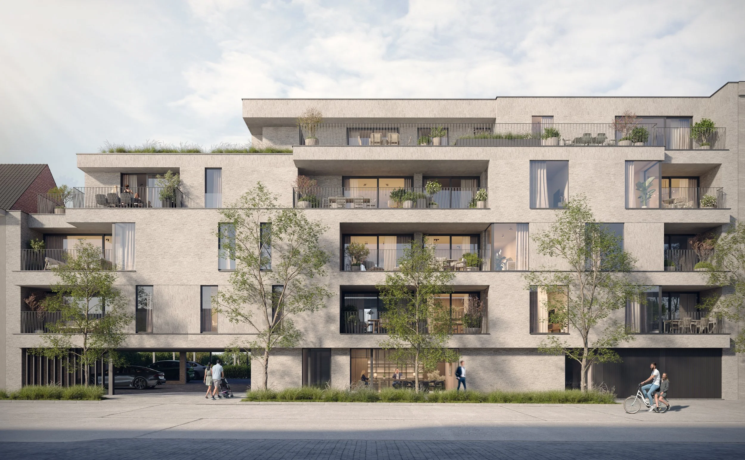 De gevarieerde volumetrie zorgt voor dieptewerking en biedt ruimte aan ruime terrassen en grote raampartijen, die overvloedig daglicht binnenlaten en het contact met buiten versterken. Het groene karakter wordt benadrukt door zorgvuldig geïntegreerde beplanting op de terrassen en in de voortuin, waardoor het geheel een zachte, bijna parkachtige uitstraling krijgt.